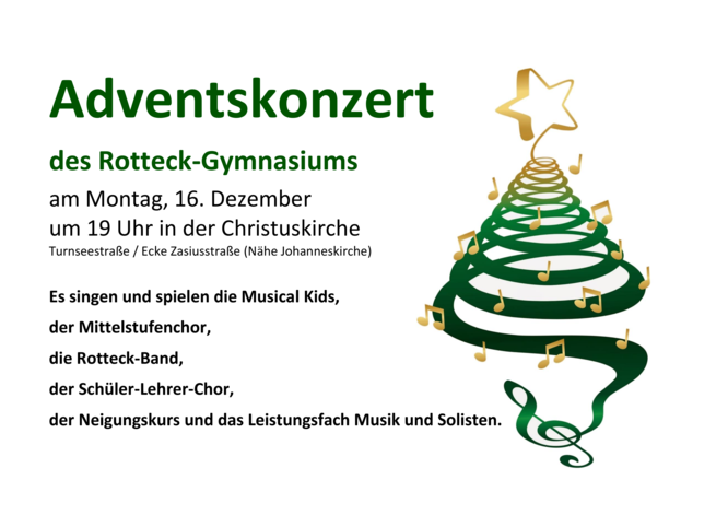 Es singen und spielen die Musical Kids, der Mittelstufenchor, die Rotteck-Band, der Schüler-Lehrer-Chor, der Neigungskurs und das Leistungsfach Musik und Solisten.