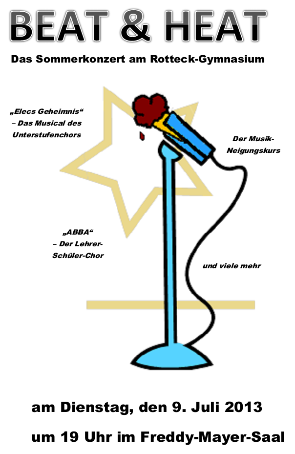 Am Dienstag, den 9. Juli 2013, findet um 19 Uhr im Freddy-Mayer-Saal das Sommerkonzert am Rotteck-Gymnasium statt.