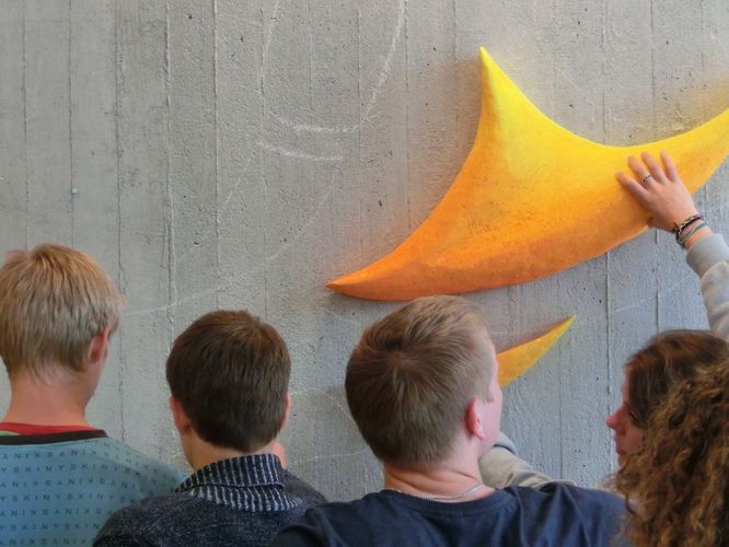 Die Schülerin aus der Gruppe wurde bedächtig und visierte noch einmal die Wandplastik an... und dann sagte sie in beschaulicher Art: "Ja, links unten ist es irdisch und organisch und entwickelt sich dann bewegt aufwärts und wird luftig und feurig und umschließt dann den blauen (wässrigen) Gegenpart nach oben hin".