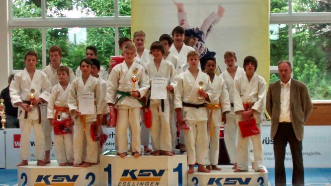 Zunächst gingen die Kämpfer der Altersklasse IV an den Start. Leider waren diese durch einen Verletzungsbedingten Ausfall stark geschwächt und konnten nur drei der fünf Gewichtsklassen besetzen. Damit war klar, dass für einen Mannschaftssieg alle drei gewinnen mussten. Zudem traf der leichteste Teilnehmer, Laurin Loewe (5b), in seiner Gewichtsklasse bis 36 kg auf bis zu 7 kg schwerere Gegner. Da Nordbaden in dieser Altersklasse keine Mannschaft stellen konnte, traf die junge Mannschaft lediglich auf zwei Gegner, nämlich die Theodor-Heuss-Realschule aus Sigmaringen und das Rosenstein-Gymnasium Heubach. Laurin trat in beiden Kämpfen sehr beherzt auf, musste sich aber letztendlich seinen übermächtigen Gegnern geschlagen geben. Severin Oschwald (5e) unterlag ebenfalls im ersten Kampf, konnte im zweiten Kampf aber in Führung gehen. Weil er diese aber nicht bis zum Schluss verteidigen konnte musste auch er sich geschlagen geben. Felix Bruder (6c) sicherte in der Gewichtsklasse über 50 kg den Ehrenpunkt für die Rotteckkämpfer. Im zweiten Kampf musste er nach beeindruckender kämpferischer Leistung leider verletzt aufgeben. Somit mussten die jungen Kämpfer sich beiden Mannschaften geschlagen geben, konnten sich aber Stolz sein auf ihre individuellen Leistungen und sich am Ende über Rang drei freuen. Am Ende gab es noch einen Freundschaftskampf gegen die zweite Mannschaft der Theodor-Heuss-Realschule Sigmaringen. Hier traten Laurin Loewe, Severin Oschwald und Philip Iloh (8a; bis 50 kg) an, der an diesem Tag eigentlich in der höheren Altersklasse startete. Zunächst ging Laurin mit einem gelungenen Hüftwurf in Führung, musste sich aber nach einer kleinen Unachtsamkeit geschlagen geben. Severin und Philip konnten ihre Kämpfe jeweils souverän gewinnen.