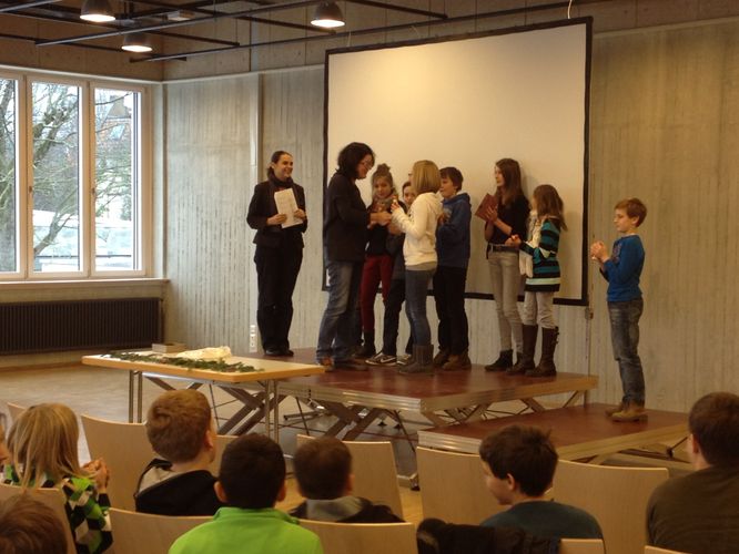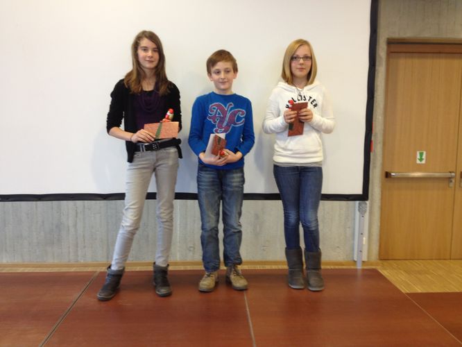 Unter großem Beifall der Zuhörer - es durften alle 6. Klassen ihre Vorlesesieger unterstützen - wurden von Frau Urlaub die ersten drei Plätze verkündet. Die besten drei Vorleser erhielten für ihre tolle Leistungen einen Büchergutschein, der Gewinner Fritz Fromm darf außerdem das Rotteck als Schulsieger an dem bald stattfindenden Stadtentscheid vertreten. Wir wünschen ihm dafür alles Gute!