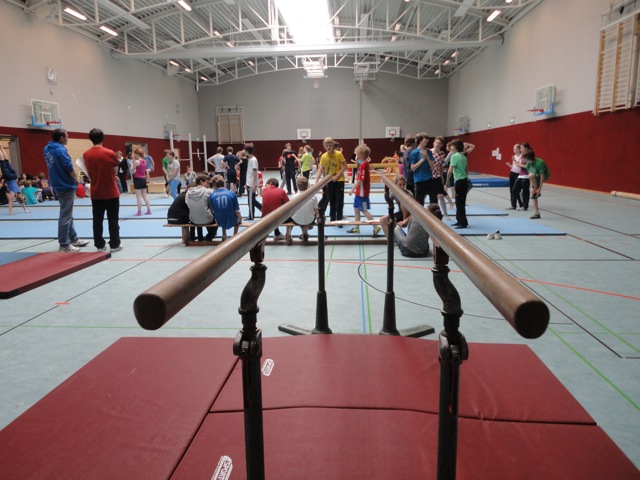 Der Turnwettkampf begann kurz nach 8.00 Uhr mit den ersten Klassen, die in sogenannten Riegen eingeteilt die einzelnen Geräte in Angriff nahmen. Zur Auswahl standen, je nach Geschlecht, folgende Geräte: Sprung, Boden, Reck, Barren, Stufenbarren und Schwebebalken.