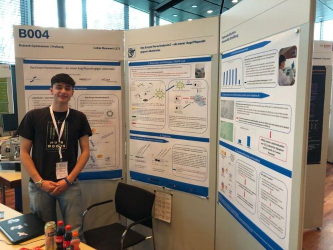 Im Rahmen seiner Forschungsarbeit hat er mit Hilfe der Genschere CRISPR-Cas9 ein Gen ausgeschaltet und dadurch entdeckt, dass dieses Gen für die Entstehung von Leberkrebs mitverantwortlich ist. Damit hat Lukas Baumert einen möglichen Angriffsunkt für die Therapie dieser tödlichen Erkrankung ausgemacht. Die Arbeit wurde durch die Universität Strasbourg betreut.