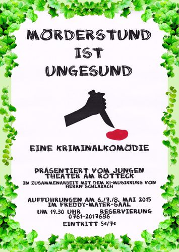 Das junge Theater präsentiert am 6./7./8. Mai um 19.30 Uhr im Freddy-Mayer-Saal die Kriminalkomödie "Mörderstund ist ungesund" von Christine Steinwasser. [mehr]