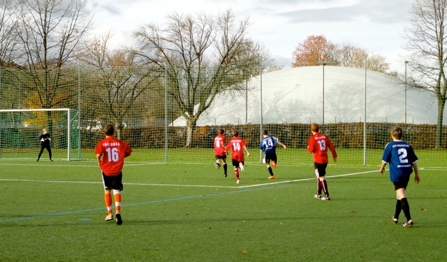 Weitaus motivierter trat die Mannschaft im zweiten Spiel auf: Eine verbesserte Abwehrarbeit, gepaart mit mehr Risikofreude nach vorne, sorgten für ein spannendes Spiel, das sehr knapp 1:0 gegen das Theodor-Heuss-Gymnasium gewonnen wurde. Capitano Daniel Schüber setzte Lukas Metzinger in der 12. Spielminute gekonnt in Szene, der mit einem scharfen Flachschuss den Angriff abschloss. Das stadtinterne Duell war damit entschieden ...
